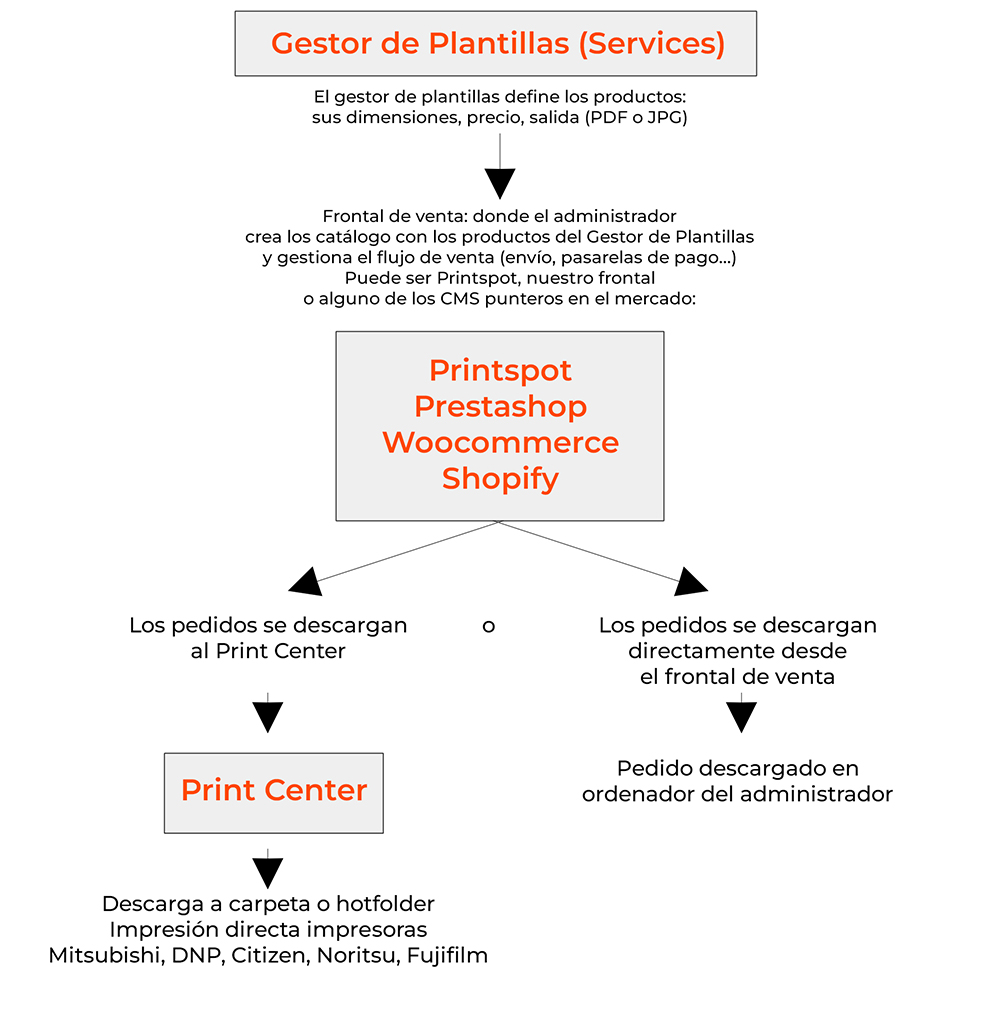 Printspot se trata del frontal de venta, es un eCommerce completo que cuenta con posibilidad de integración con otras páginas webs. Es tu expositor digital con los clientes. En definitiva, es donde tus clientes realizarán sus compras, donde configurarás elementos propios de la tienda, como las tarifas de los gastos de envío, las formas de pago, etc.