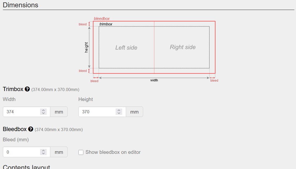Y configuraremos el ancho y el alto de la hoja así como su sangre, en el ejemplo que estamos, ya que la portada y contraportada sin sangre miden 374 de ancho por 370 de alto, por lo tanto ése será el tamaño de las hojas.