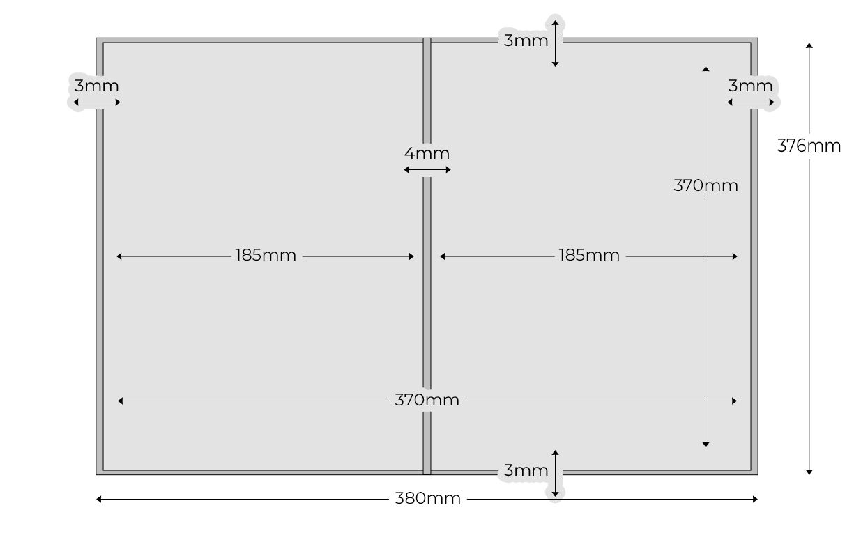 Ancho contraportada (185mm) + ancho portada (185mm) + ancho del lomo (4mm) + sangre lado derecho (3mm) + sangre lado izquierdo (3mm)