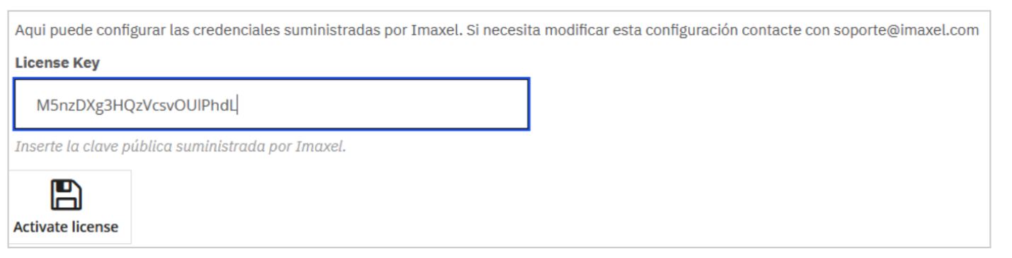 Access the **Configuration** section and enter the license key provided by Imaxel.