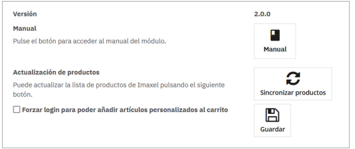 - Product Update: Allows you to synchronize Imaxel templates in your PrestaShop. Every time you create a new template in the Template Manager, you must update the information in PrestaShop using this button.