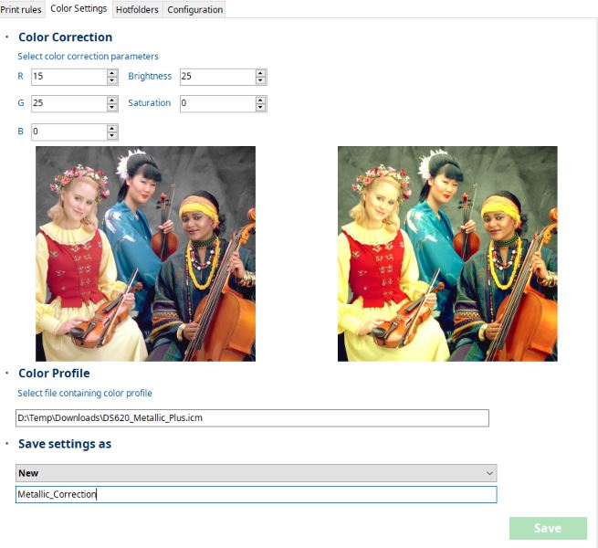 The color settings section allows you to store adjustment configurations that can later be applied to the processing of a print rule.