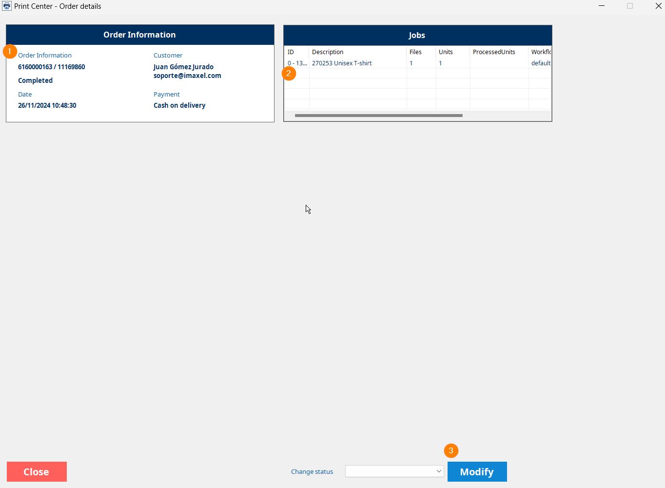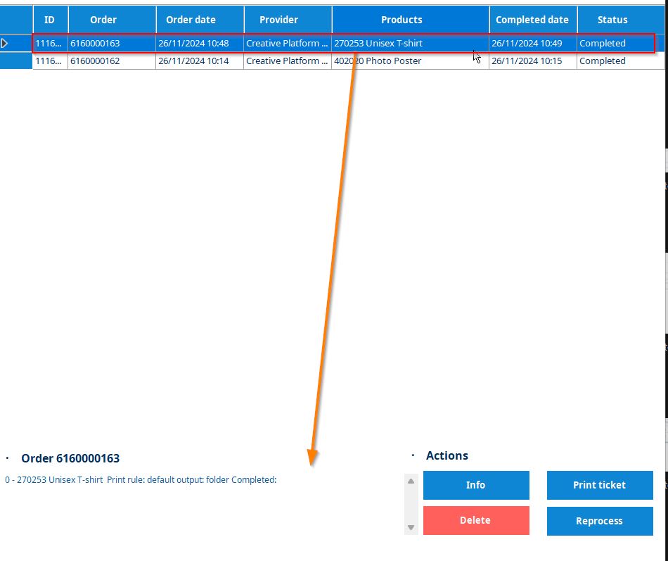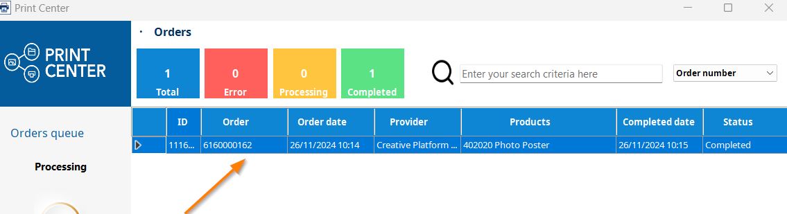 In the **Orders screen** of the **Print Center**, we will receive all orders for production and where we can obtain details about them.